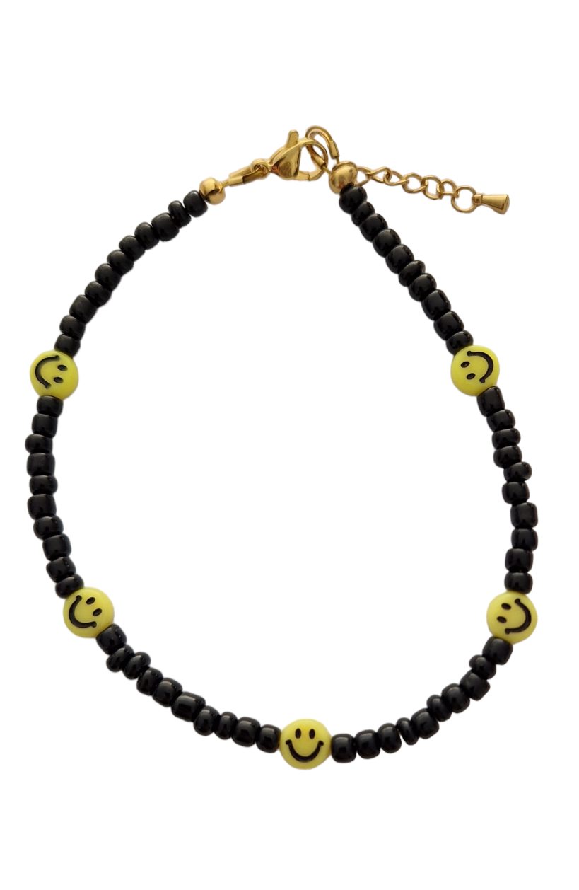 RVS bandje met gekleurde glaskralen en smileykralen.