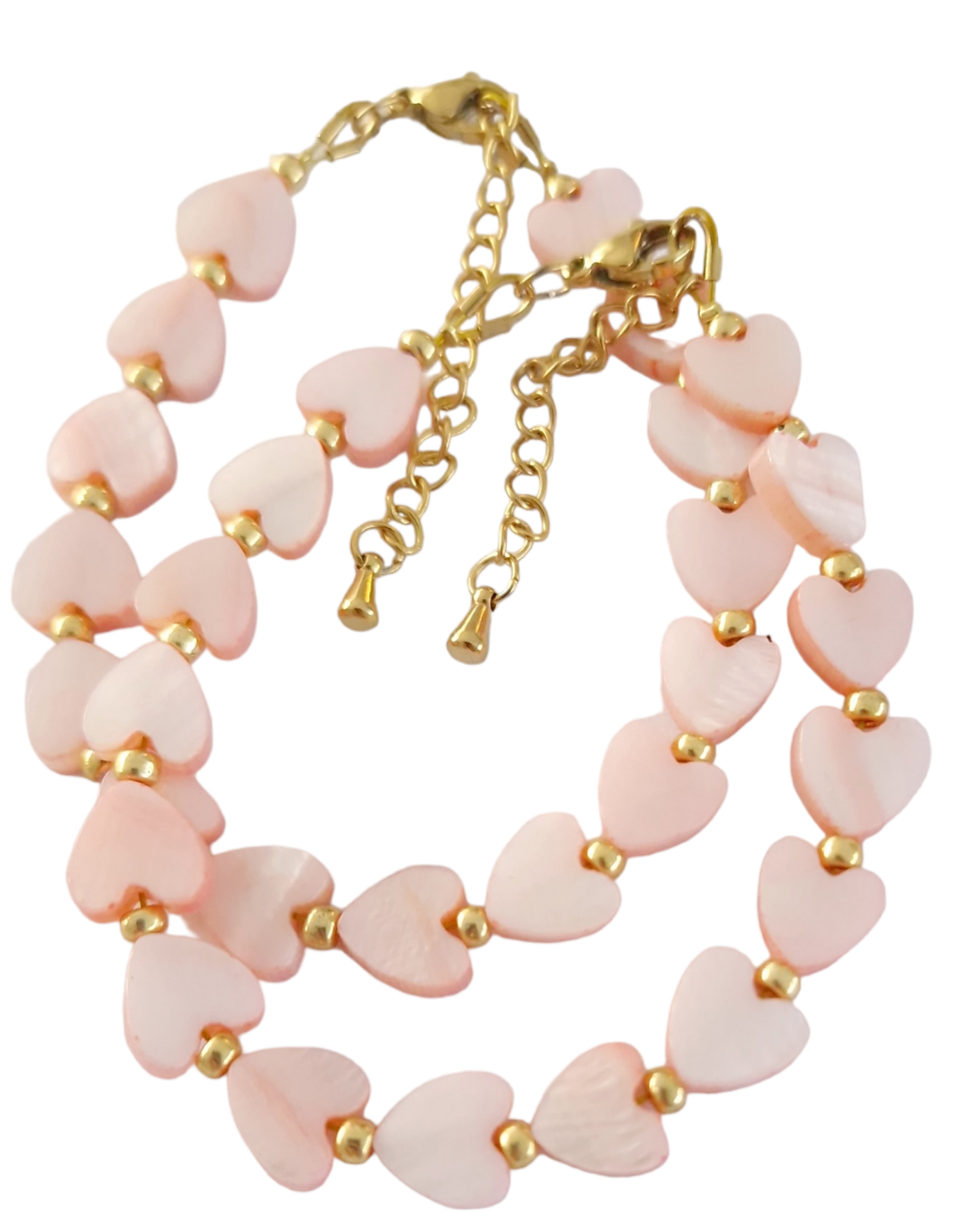 Mooie handgemaakte, stainless steel (verkleurd niet) armband gemaakt met licht roze hartjes schelpen kralen.