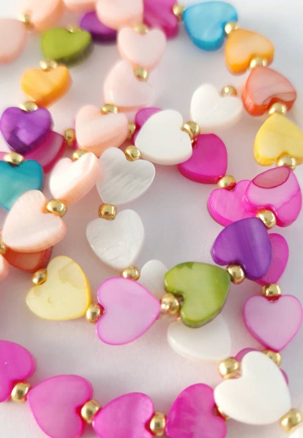 Mooie handgemaakte, elastische armband gemaakt met licht roze hartjes schelpen kralen.